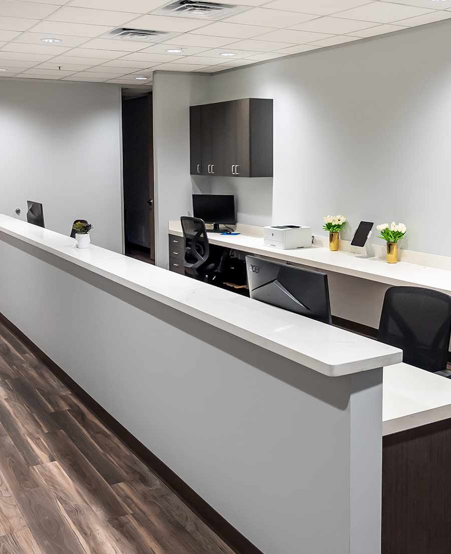 Our boutique practice features a welcoming reception area with warm wood accents, soothing blue branding, private consultation rooms, and the latest diagnostic and treatment technology, all designed for privacy, efficiency, and a calm, confident experience from start to finish.