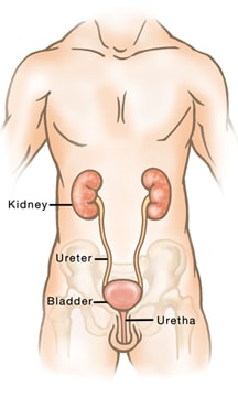 The bladder is a hollow organ in the lower abdomen. It stores urine, the liquid waste produced by the kidneys. Urine passes from each kidney into the bladder through a tube called a ureter. Urine leaves the bladder and exits the body through another tube called the urethra.