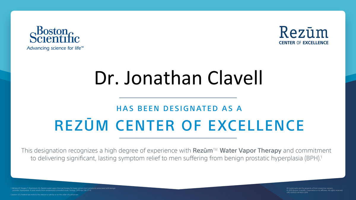 Dr. Jonathan Clavell is one of Houston’s leaders in Rezūm BPH treatment. As a fellowship-trained urologist, Dr. Clavell has had extensive training using Rezūm to help men get relief from symptoms of BPH. He is involved in training surgeons both nationally and internationally regarding Rezum for BPH. If you are experiencing symptoms such as frequent urination, a weak or slow urinary stream, difficulty starting urination, or the inability to urinate, call (713) 424-4030 to schedule your consultation with Dr. Clavell at his urology clinic in Houston today.